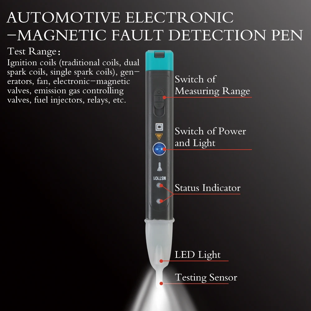 El detector MST-101 está utilizando tecnología avanzada de Alemania, puede recopilar y analizar señales en piezas eléctricas automotrices no desmanteladas, los resultados de las pruebas se muestran mediante un indicador LED y un buscapersonas. Es fácil saber si hay fallas en las piezas electrónicas automotrices.